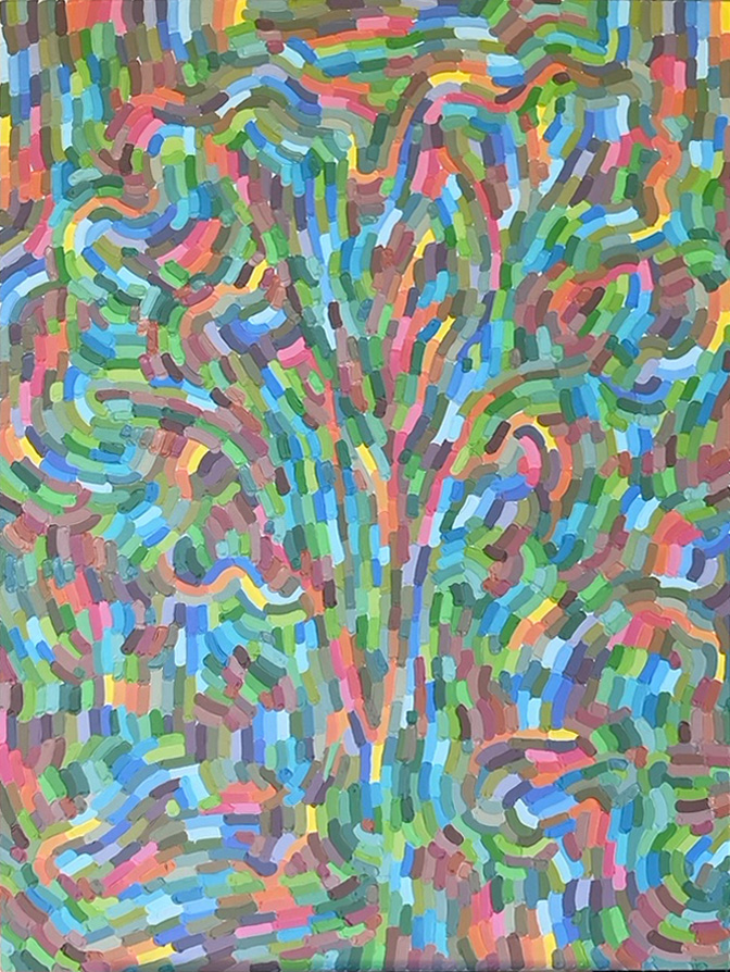 My practice aims to create a balance in the relationship between intention and intuition. Colour perception is fundamental to both the creation and viewing of the paintings. The process of painting is one of investigation and surprise, as colour and forms shift, intertwine, then disconnect to form new relationships within the space of the painting. The works describe a world of interdependence, rather than independence.